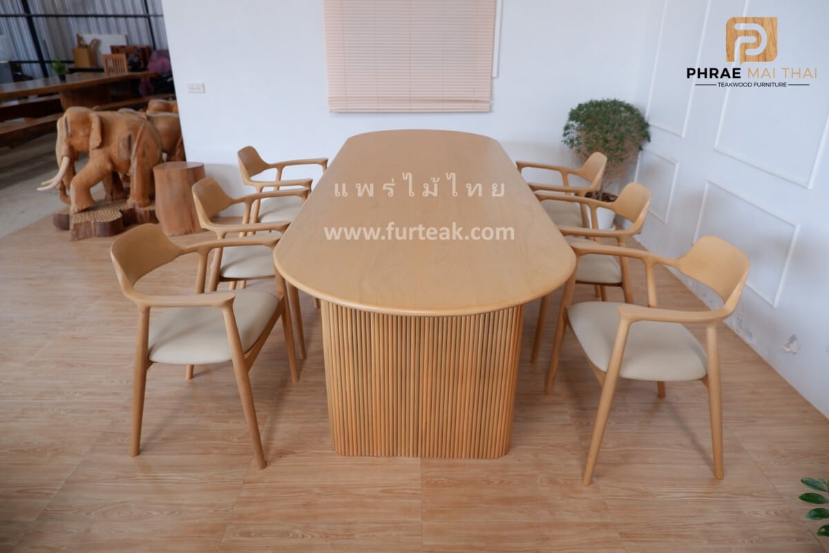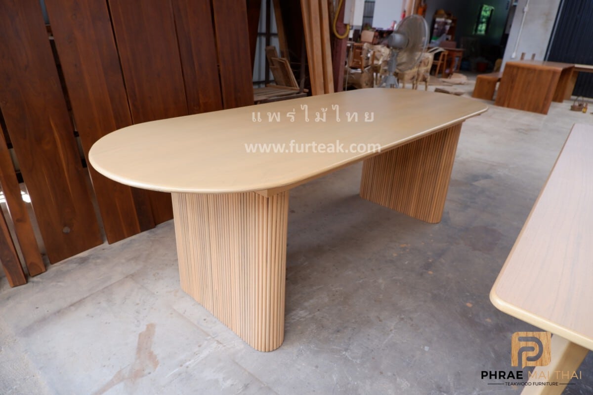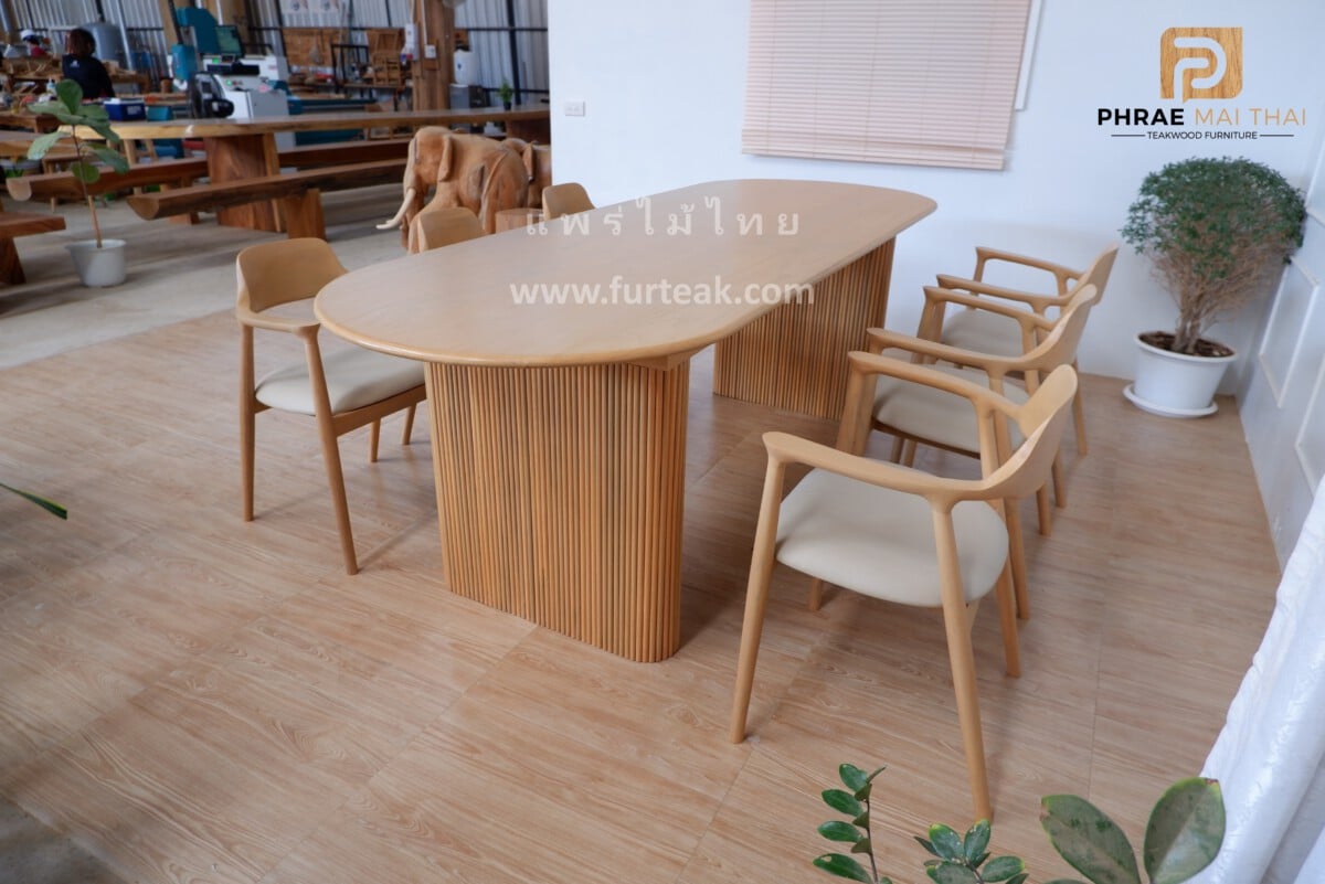 โต๊ะอาหาร วงรี ขาทึบเป็นซี่ ยาว 2.5 เมตร เป็นไม้สักทองอบแห้ง ซึ่งคุณสมบัติของไม้เป็นไม้เนื้อแข็งอายุตั้งแต่ 30 ปีขึ้นไป เราเลือกใช้ไม้สักที่มีคุณภาพและใช้กระบวนการอบไม้ จึงทำให้ไม้มีการคงสภาพ ความชื้นน้อย และ โอกาสไม้หดตัวน้อยมาก
