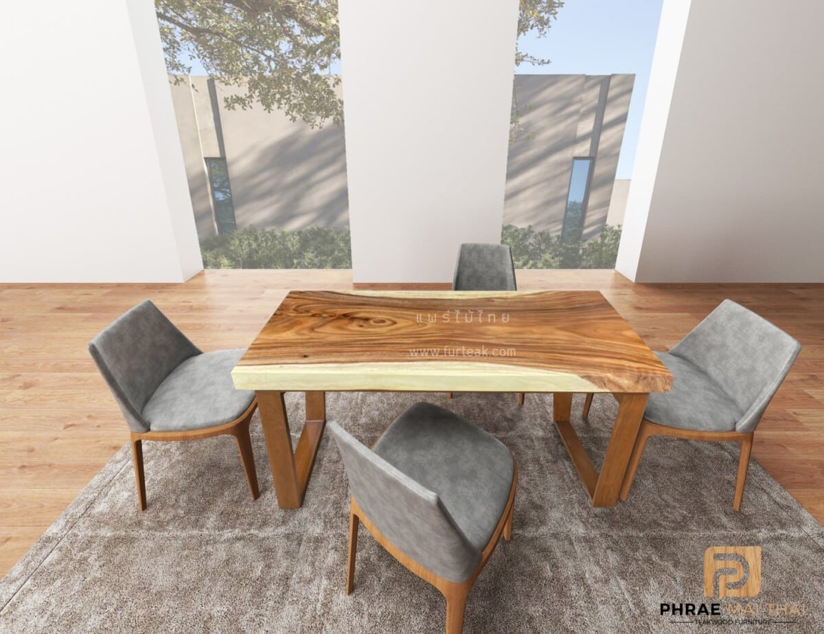โต๊ะอาหารโมเดิร์น ไม้จามจุรีแผ่นเดียว ขาไม้สักทรงคางหมู (สินค้าเป็นเพียงภาพตัวอย่าง หากสั่งผลิตลายไม้สักจะแตกต่างกันออกไปในแต่ละครั้ง)
