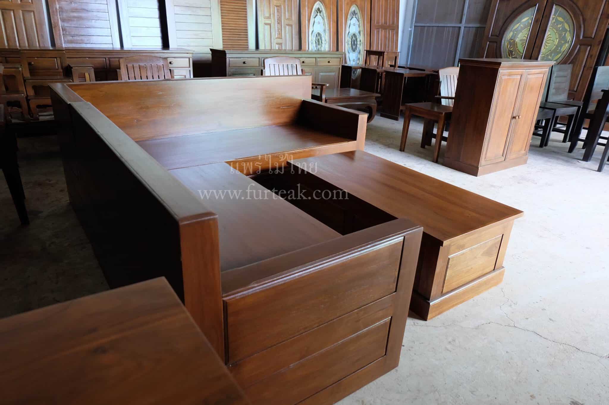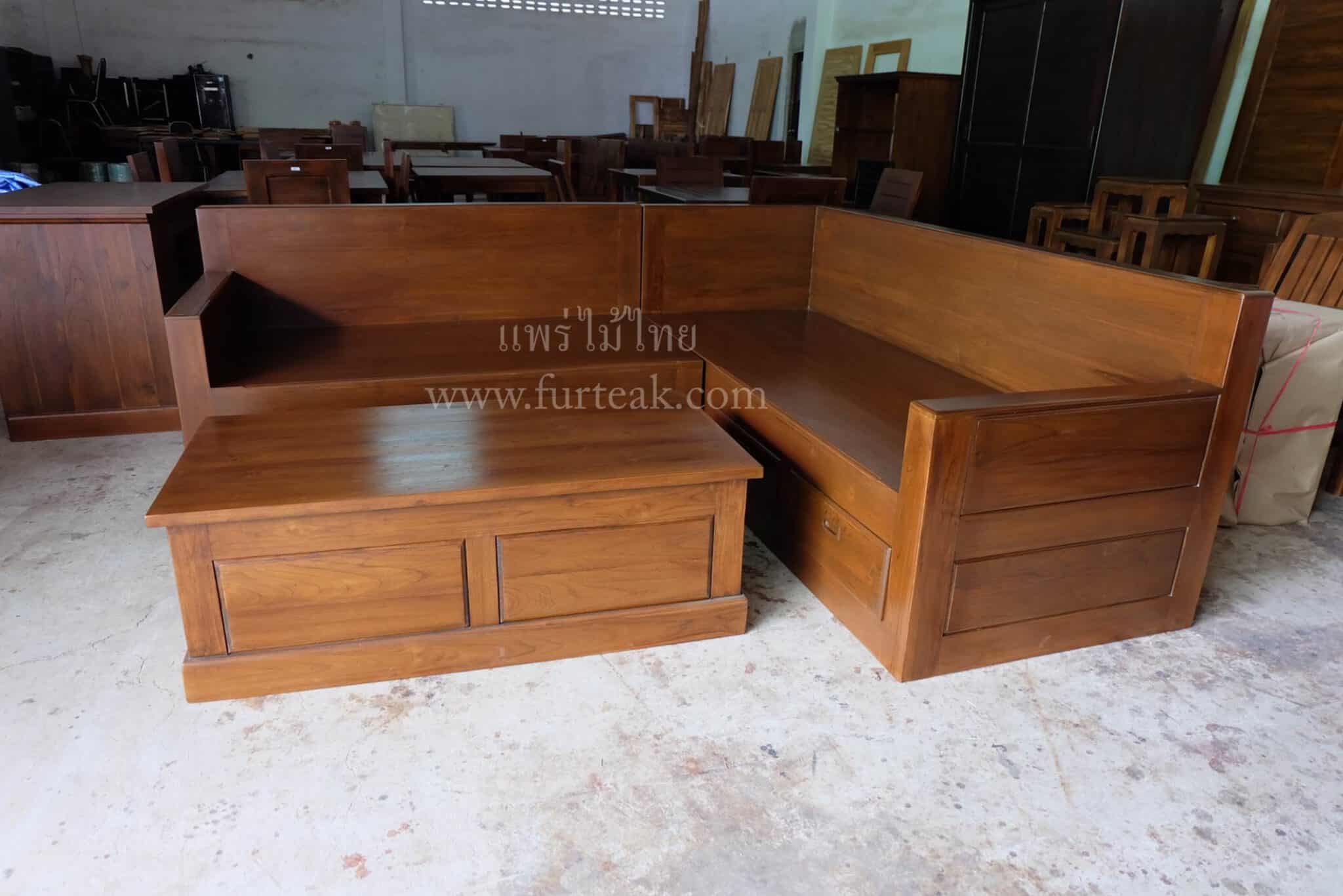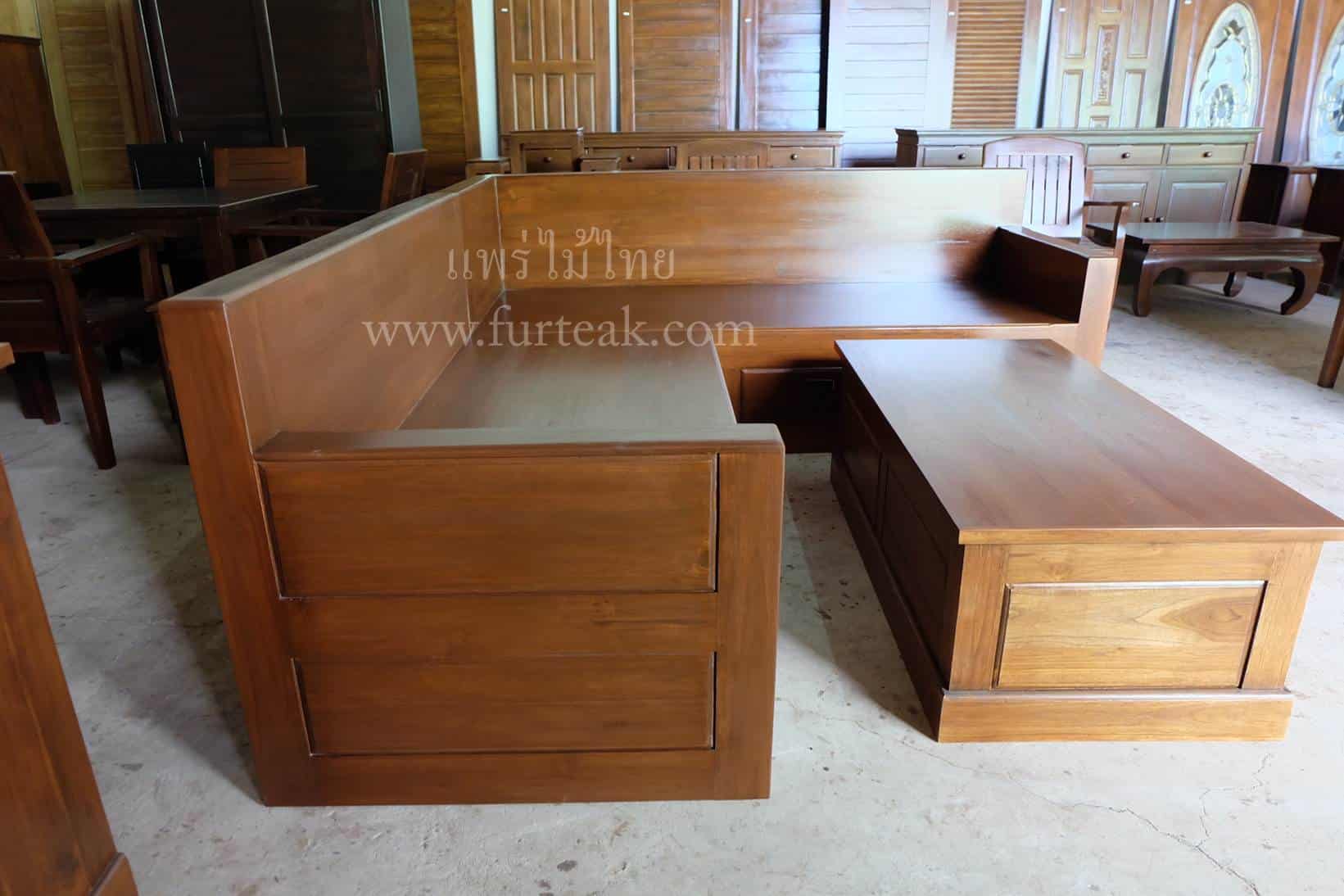 ชุดรับแขกกล่อง ตัว L ประกอบไปด้วยโซฟา 2 ตัว โต้ะกลาง 1 ตัวมีพนักพิงรอบด้าน สีสักเข้มเป็นไม้สักทองอบแห้ง ซึ่งคุณสมบัติของไม้เป็นไม้เนื้อแข็งอายุตั้งแต่ 30 ปีขึ้นไป เราเลือกใช้ไม้สักที่มีคุณภาพและใช้กระบวนการอบไม้ จึงทำให้ไม้มีการคงสภาพ ความชื้นน้อย และโอกาสไม้หดตัวน้อยมาก