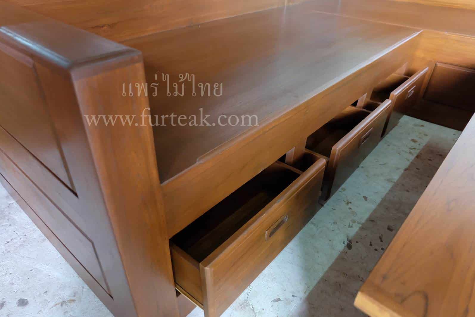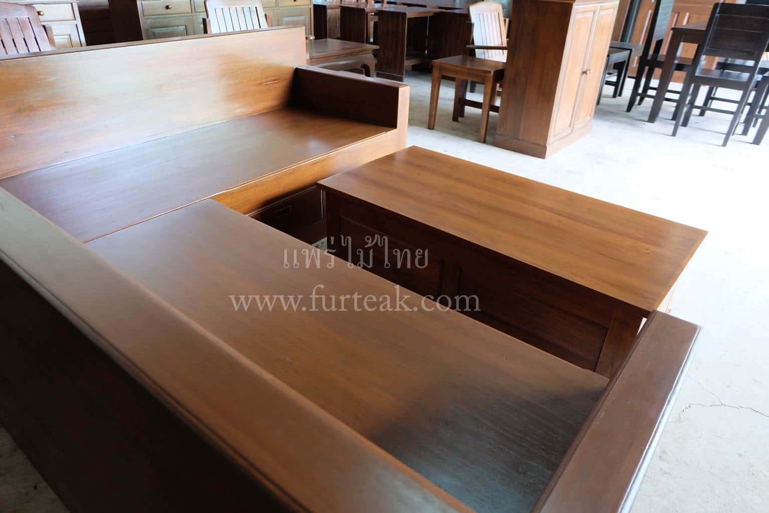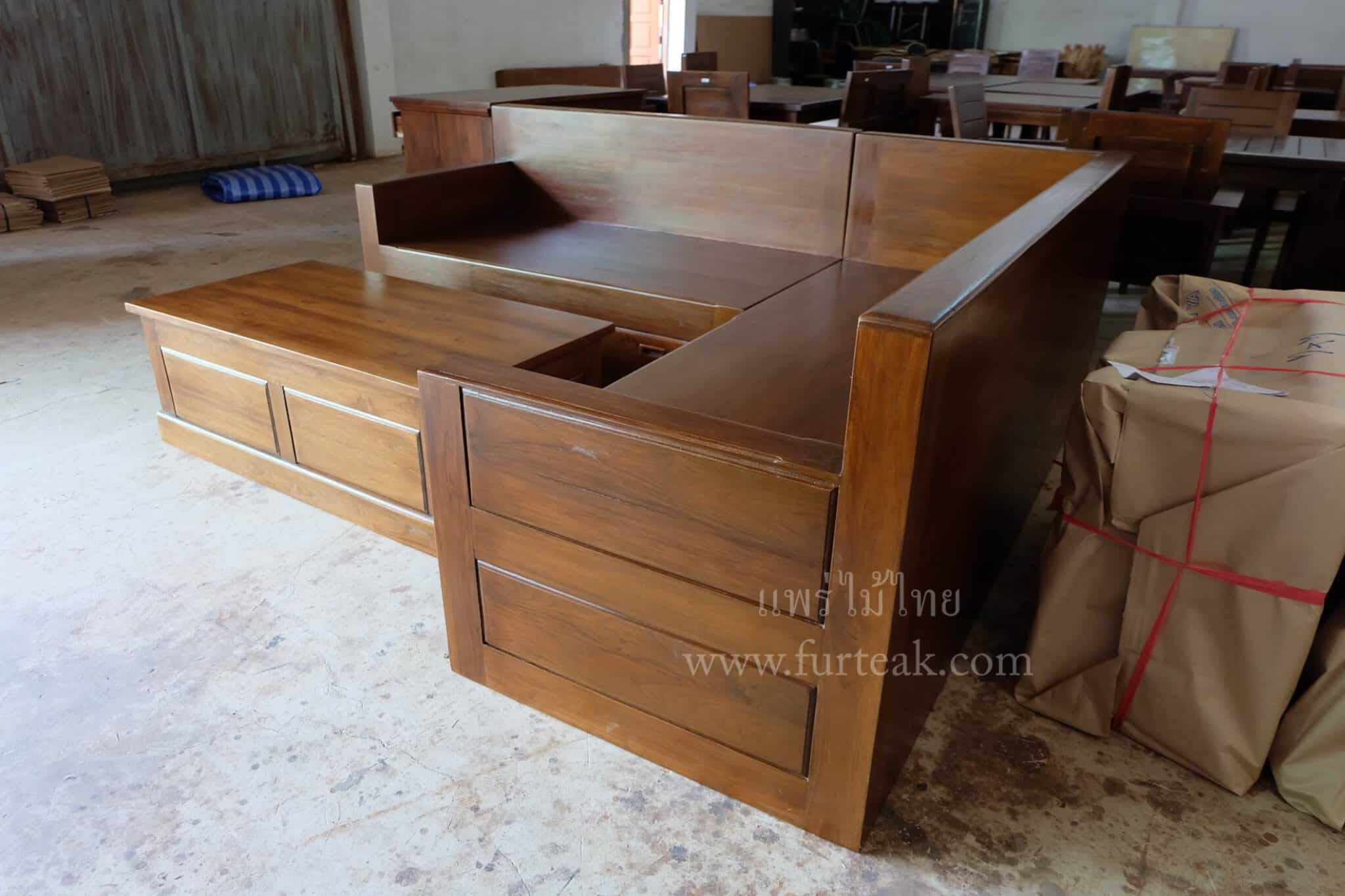 ชุดรับแขกกล่อง ตัว L ประกอบไปด้วยโซฟา 2 ตัว โต้ะกลาง 1 ตัวมีพนักพิงรอบด้าน สีสักเข้มเป็นไม้สักทองอบแห้ง ซึ่งคุณสมบัติของไม้เป็นไม้เนื้อแข็งอายุตั้งแต่ 30 ปีขึ้นไป เราเลือกใช้ไม้สักที่มีคุณภาพและใช้กระบวนการอบไม้ จึงทำให้ไม้มีการคงสภาพ ความชื้นน้อย และโอกาสไม้หดตัวน้อยมาก