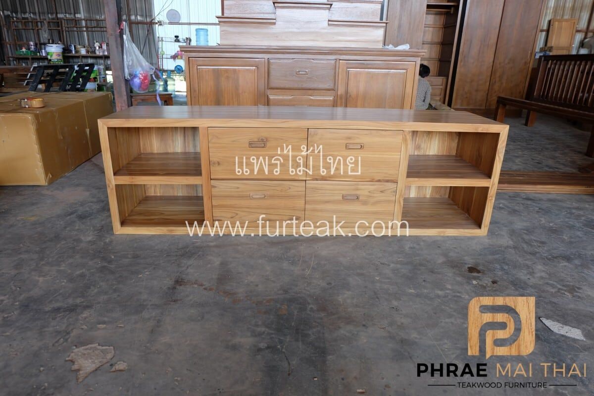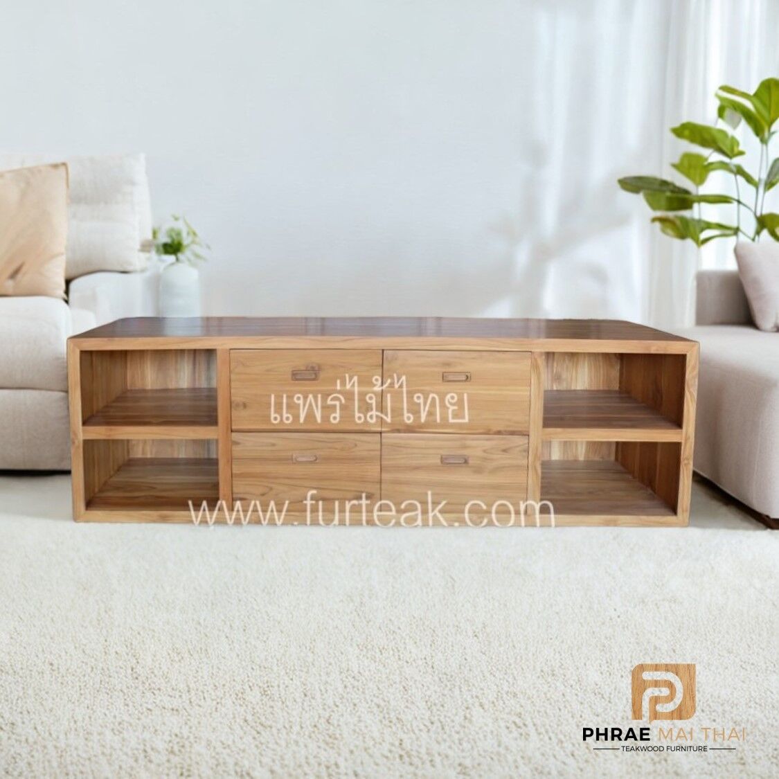 ชั้นวางทีวี รูปแบบโมเดิร์น เรียบหรู ประกอบด้วย 4ลิ้นชัก และ 4ชั้นวางของ เป็นไม้สักทองอบแห้ง ซึ่งคุณสมบัติของไม้เป็นไม้เนื้อแข็งอายุตั้งแต่ 30 ปีขึ้นไป เราเลือกใช้ไม้สักที่มีคุณภาพและใช้กระบวนการอบไม้ จึงทำให้ไม้มีการคงสภาพ ความชื้นน้อย และโอกาสไม้หดตัวน้อยมาก