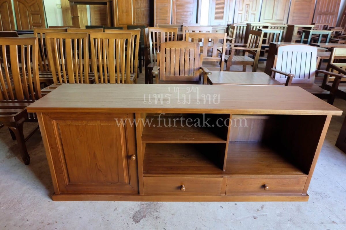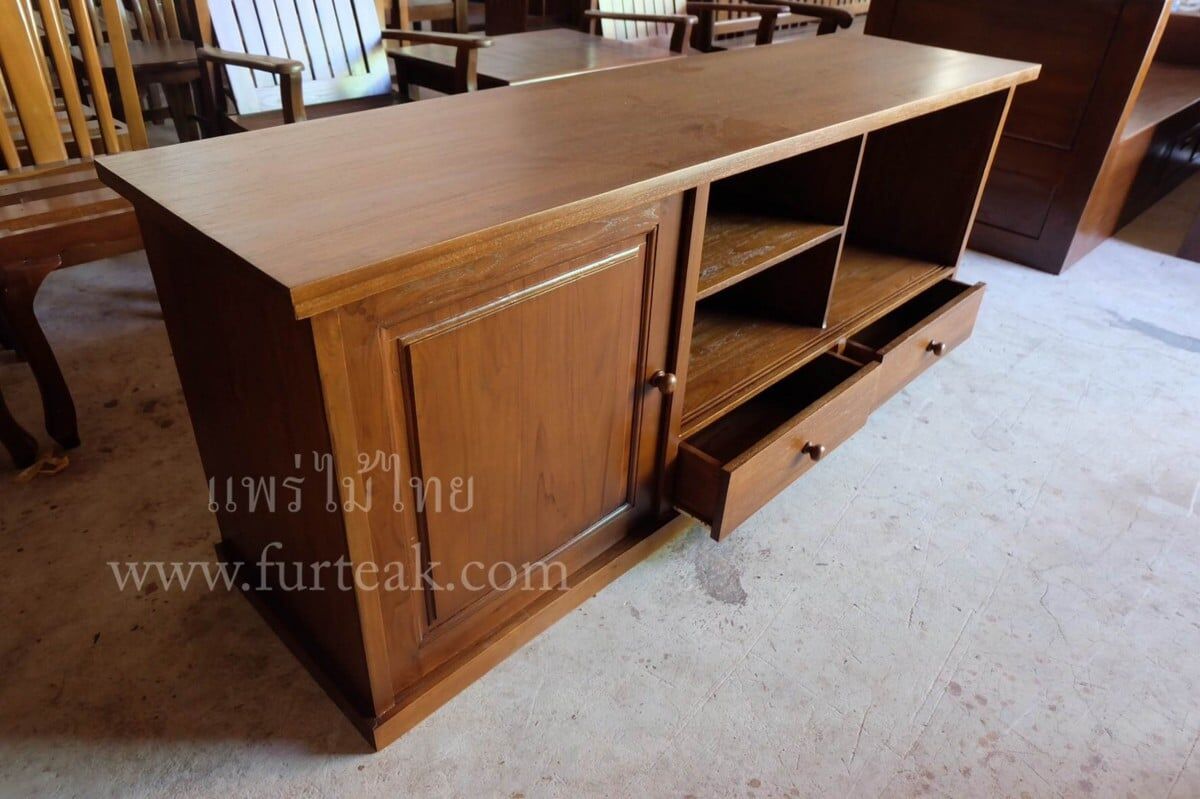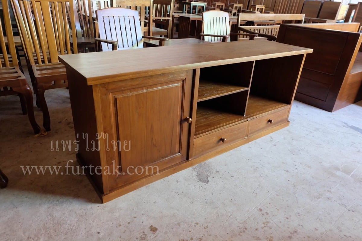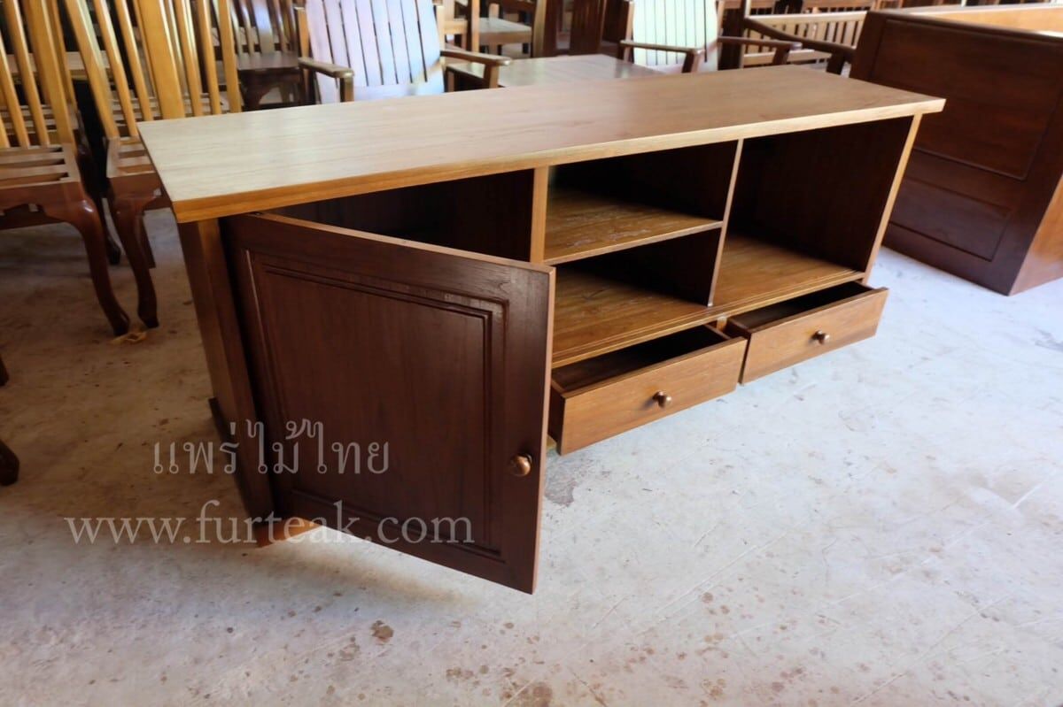 ชั้นวางทีวีไม้สัก ประกอบไปด้วยบานเปิด-ปิด และ 2 ลิ้นชักล่าง สีสักเข้ม เป็นไม้สักทองอบแห้ง ซึ่งคุณสมบัติของไม้เป็นไม้เนื้อแข็งอายุตั้งแต่ 30 ปีขึ้นไป เราเลือกใช้ไม้สักที่มีคุณภาพและใช้กระบวนการอบไม้ จึงทำให้ไม้มีการคงสภาพ ความชื้นน้อย และโอกาสไม้หดตัวน้อยมาก