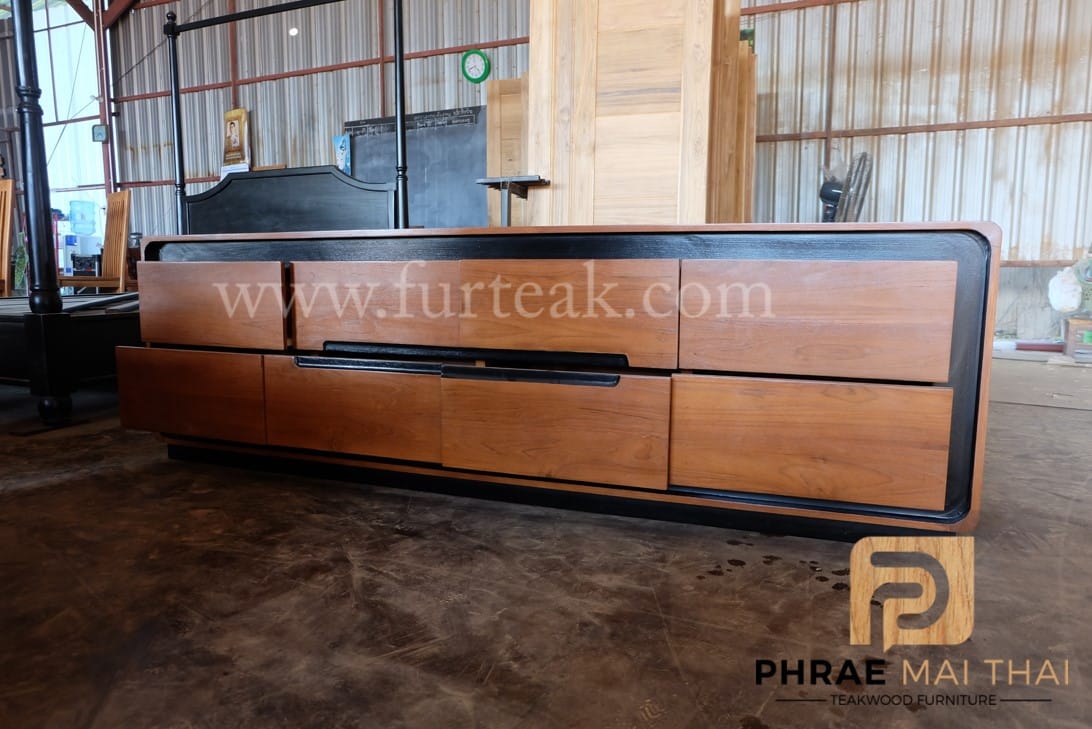 Sideboard 8 ลิ้นชัก modern art สีสักทองเป็นไม้สักทองอบแห้ง ซึ่งคุณสมบัติของไม้เป็นไม้เนื้อแข็งอายุตั้งแต่ 30 ปีขึ้นไป เราเลือกใช้ไม้สักที่มีคุณภาพและใช้กระบวนการอบไม้ จึงทำให้ไม้มีการคงสภาพ ความชื้นน้อย และโอกาสไม้หดตัวน้อยมาก
