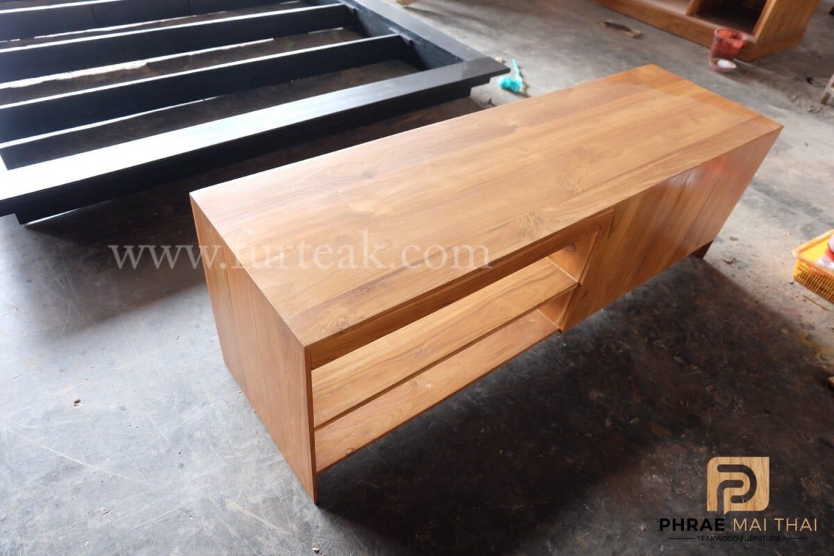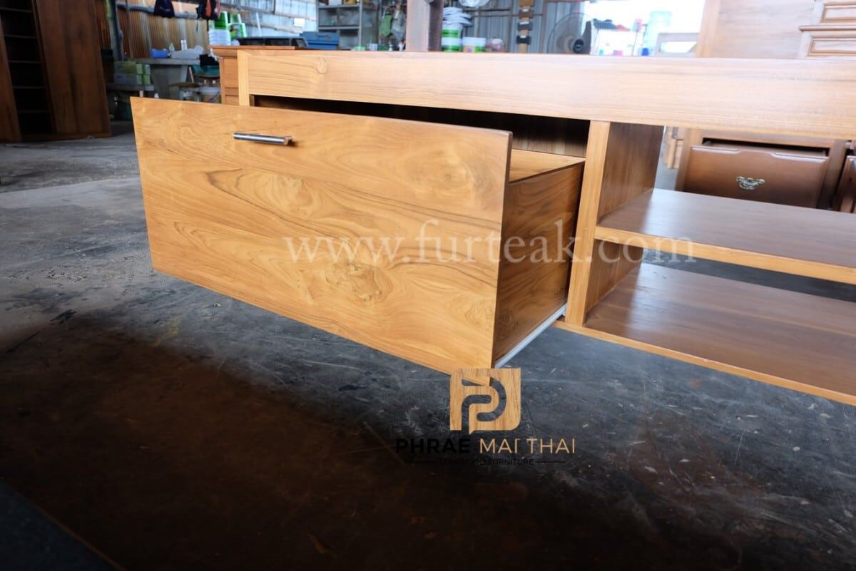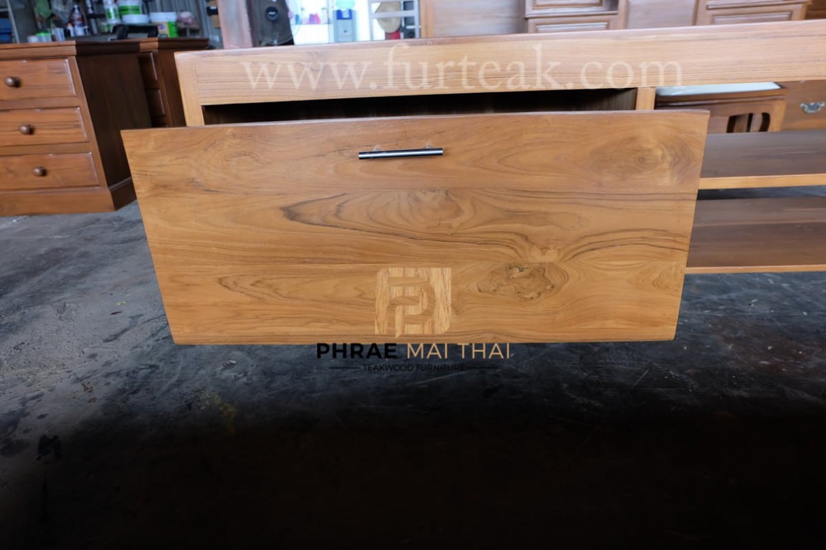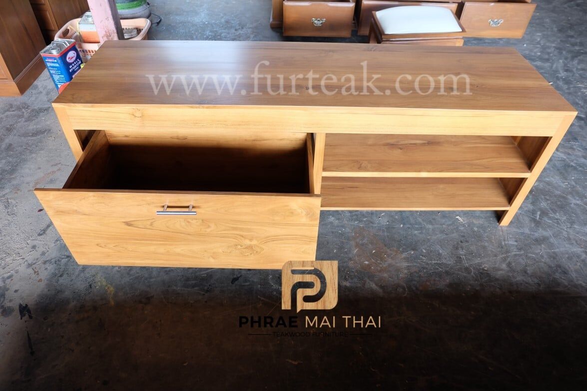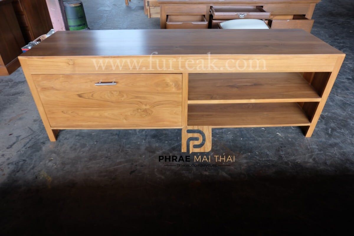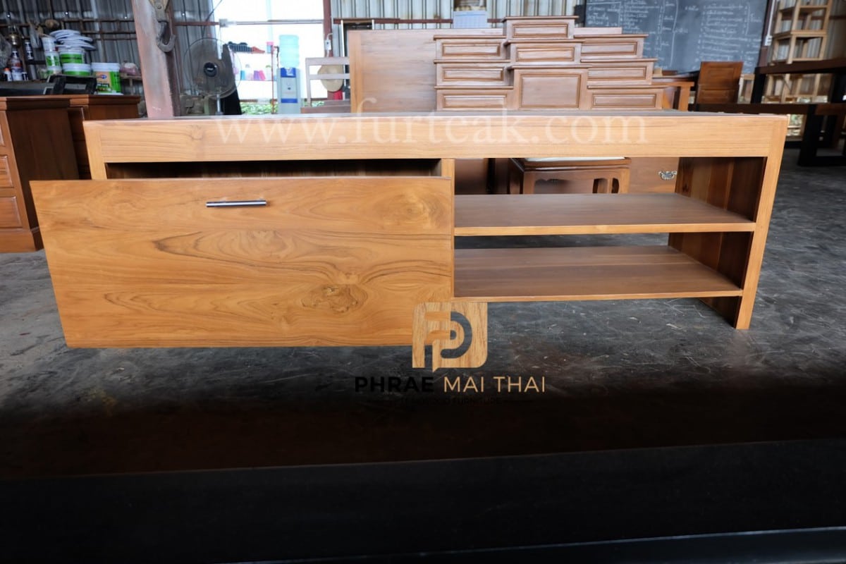 ชั้นวางทีวีโมเดิร์น ประกอบไปด้วย 1 ลิ้นชัก ฝั่งขวาสามารถวางของตกแต่งได้ สีธรรมชาติเป็นไม้สักทองอบแห้ง ซึ่งคุณสมบัติของไม้เป็นไม้เนื้อแข็งอายุตั้งแต่ 30 ปีขึ้นไป เราเลือกใช้ไม้สักที่มีคุณภาพและใช้กระบวนการอบไม้ จึงทำให้ไม้มีการคงสภาพ ความชื้นน้อย และโอกาสไม้หดตัวน้อยมาก