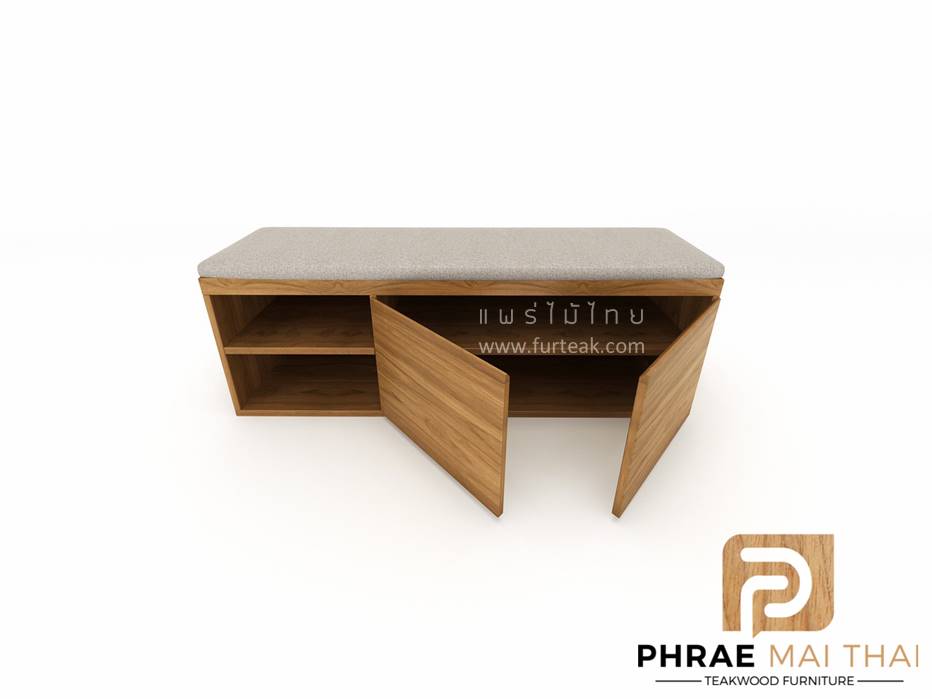 ตู้รองเท้าแบบนั่งได้ มีบานเปิด-ปิด พร้อมเบาะนั่ง สไตล์คอนโด ซึ่งคุณสมบัติของไม้เป็นไม้เนื้อแข็งอายุตั้งแต่ 30-50 ปีขึ้นไป เราเลือกใช้ไม้สักที่มีคุณภาพและใช้กระบวนการอบไม้ จึงทำให้ไม้มีการคงสภาพ ความชื้นน้อย และโอกาสไม้หดตัวน้อยมาก