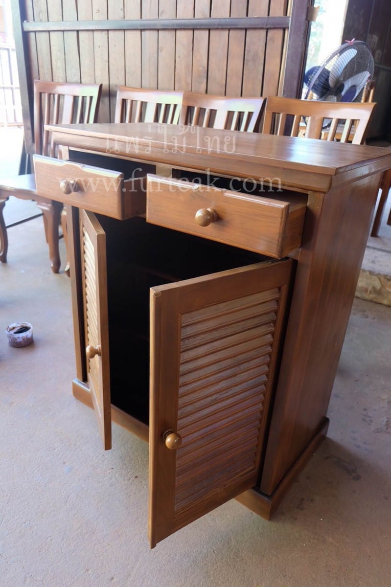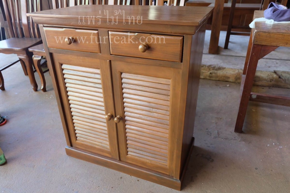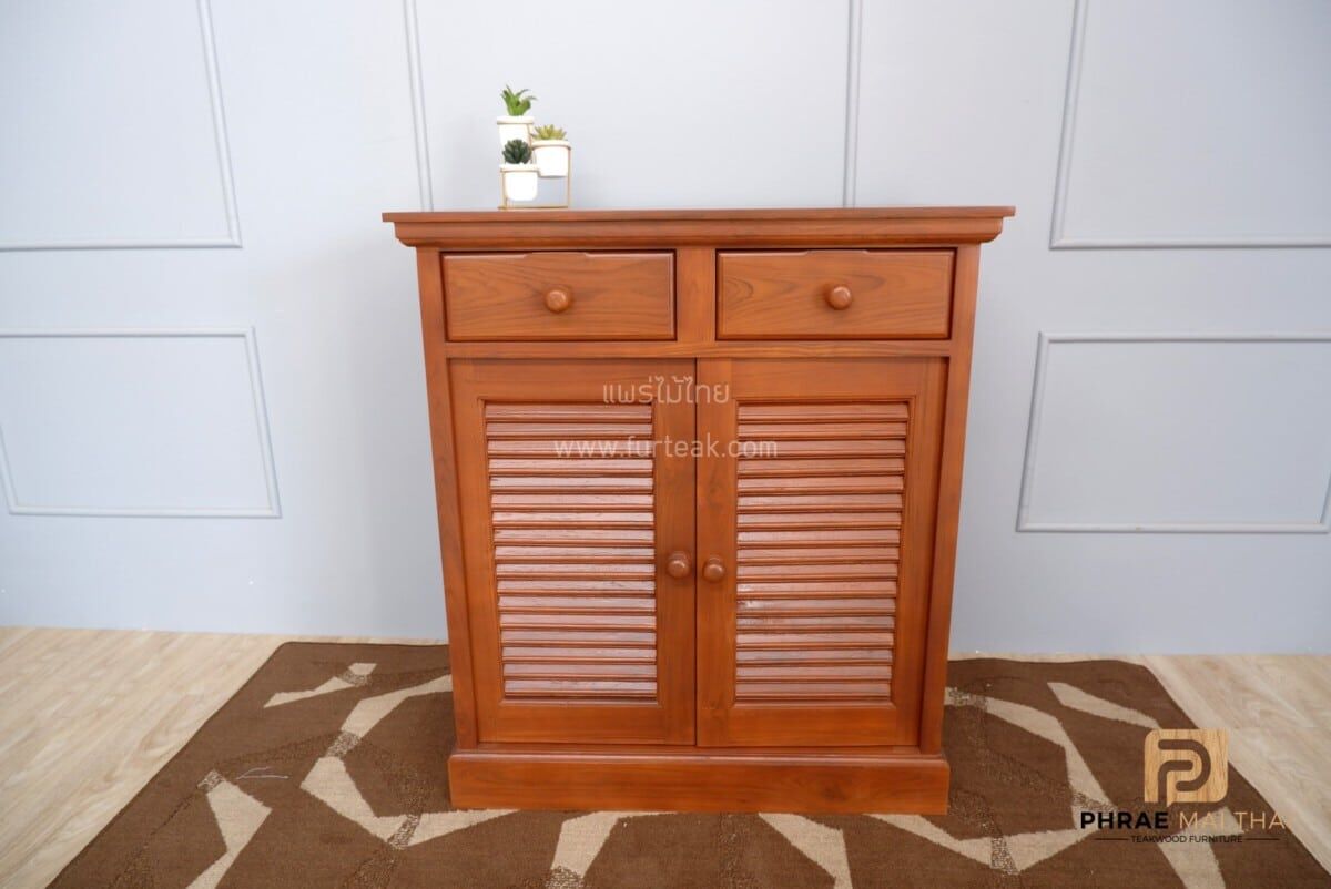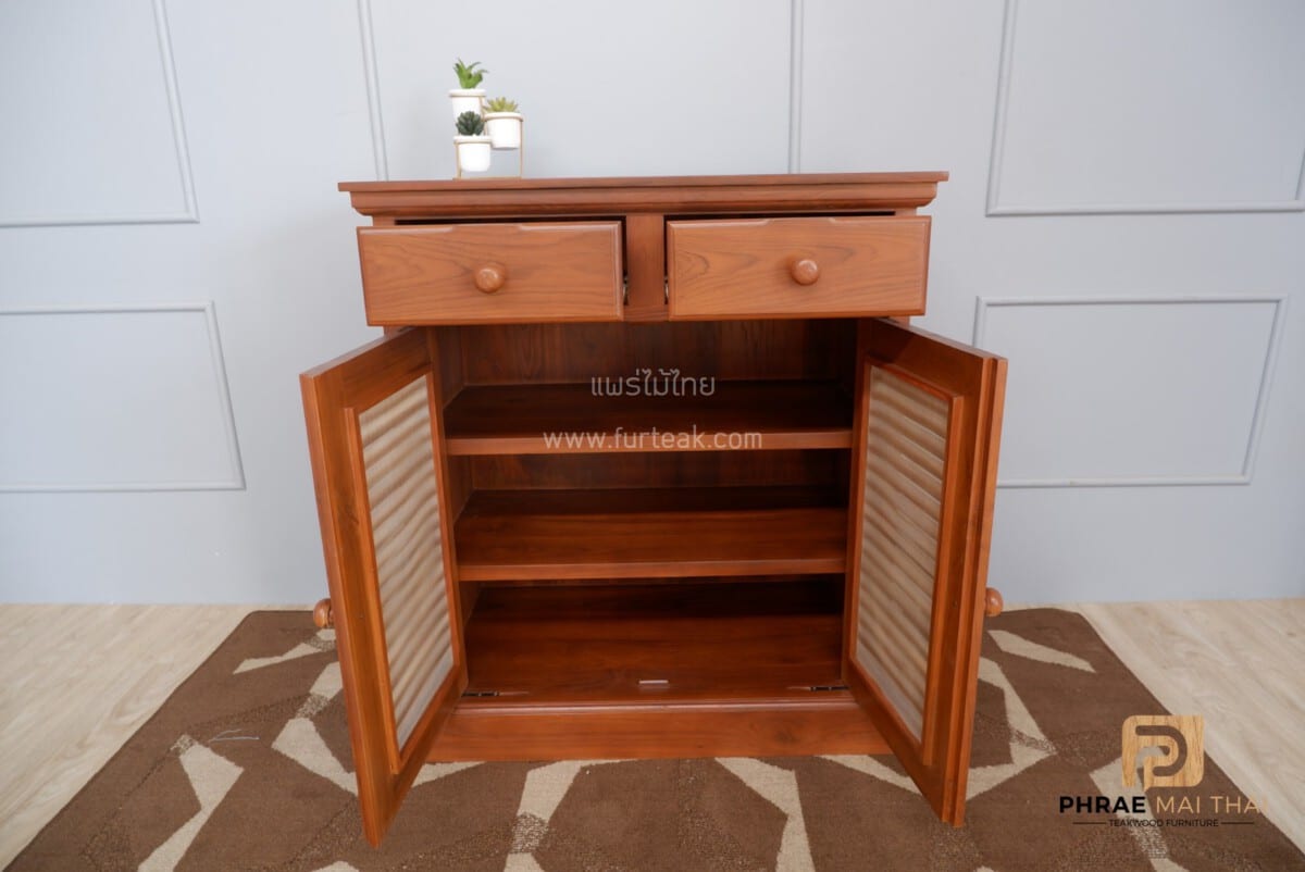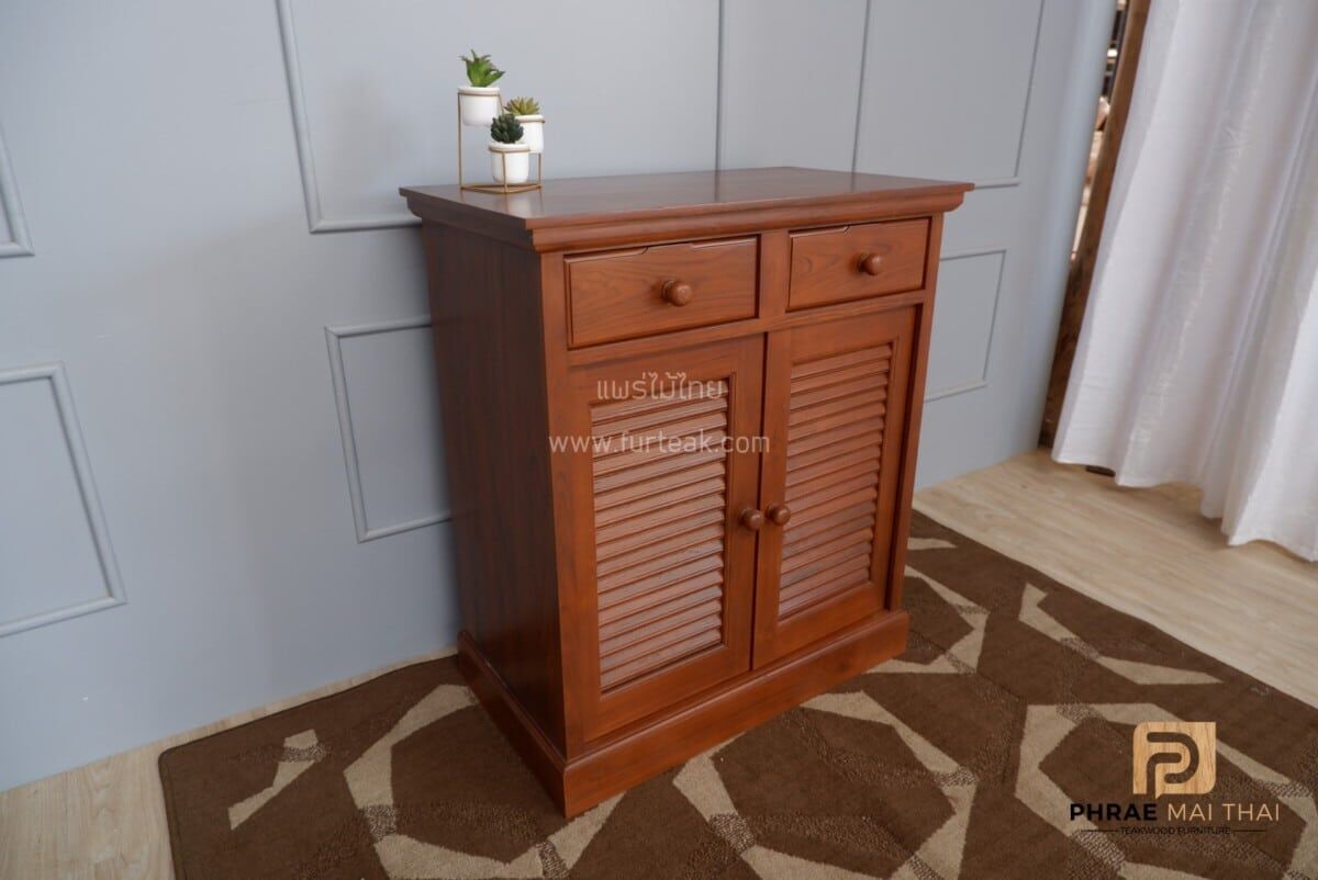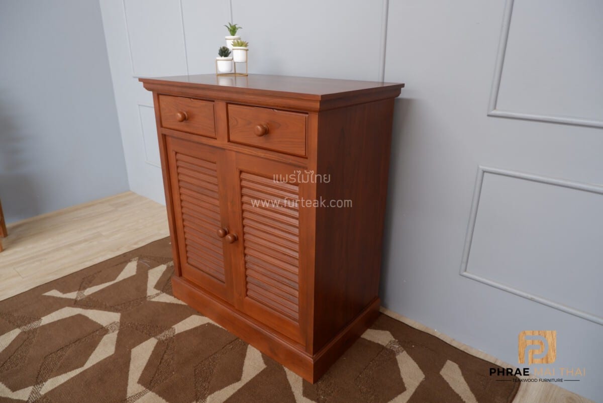 ตู้รองเท้าไม้สัก ประกอบไปด้วย 2 ลิ้นชักบานเปิด-ปิดด้านล่าง สีสักเข้มเป็นไม้สักทองอบแห้ง ซึ่งคุณสมบัติของไม้เป็นไม้เนื้อแข็งอายุตั้งแต่ 30 ปีขึ้นไป เราเลือกใช้ไม้สักที่มีคุณภาพและใช้กระบวนการอบไม้ จึงทำให้ไม้มีการคงสภาพ ความชื้นน้อย และโอกาสไม้หดตัวน้อยมาก