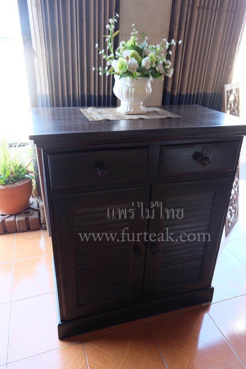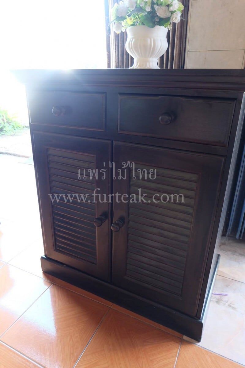 ตู้รองเท้า/ชั้นวางรองเท้าสีโอ๊คดำ เป็นไม้สักทองอบแห้งประกอบไปด้วย 2 บานปิด-เปิด 2 ลิ้นชัก ซึ่งคุณสมบัติของไม้เป็นไม้เนื้อแข็งอายุตั้งแต่ 30 ปีขึ้นไป เราเลือกใช้ไม้สักที่มีคุณภาพและใช้กระบวนการอบไม้ จึงทำให้ไม้มีการคงสภาพ ความชื้นน้อย และโอกาสไม้หดตัวน้อยมาก