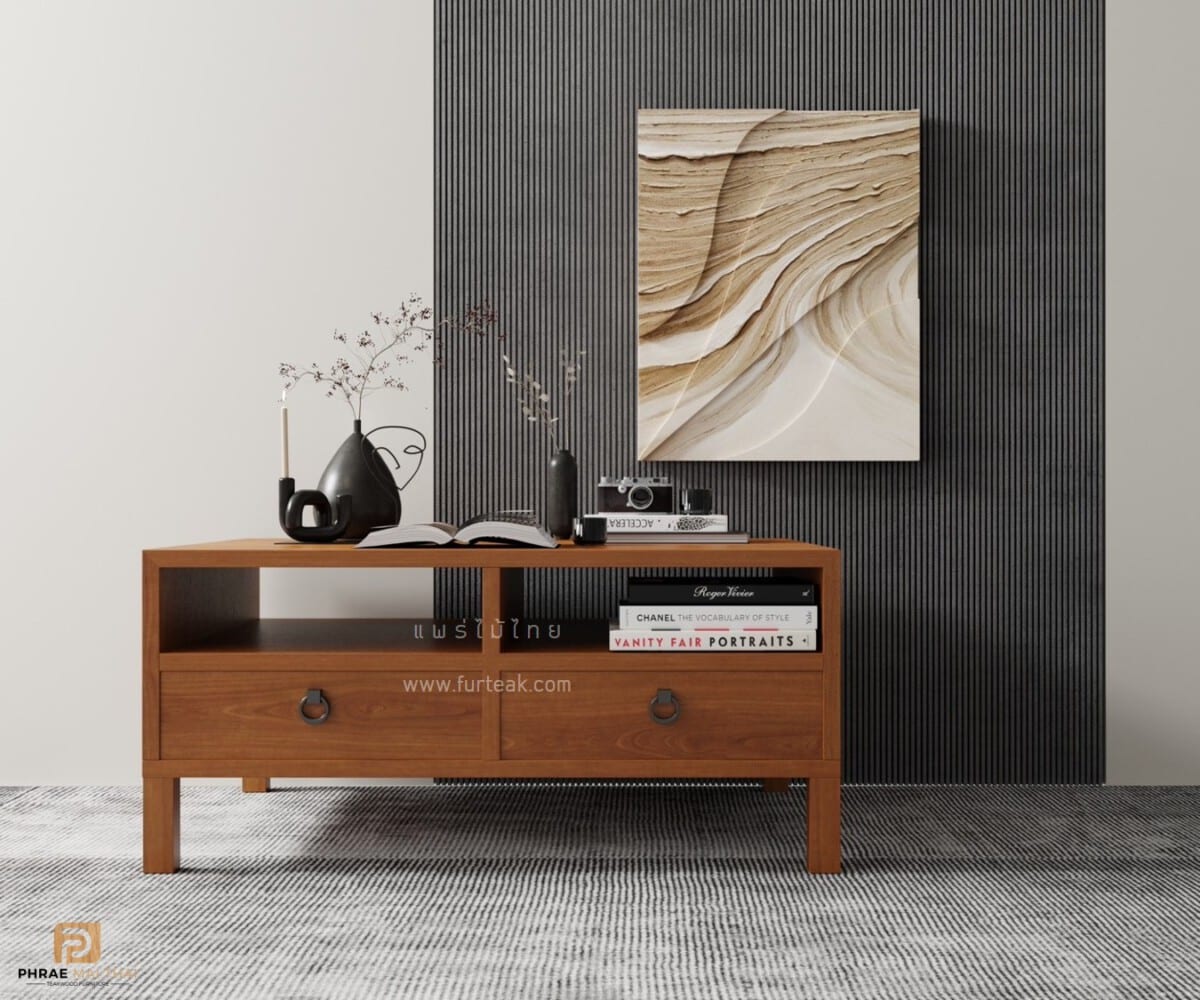 โต๊ะกลางโซฟา มี 2 ลิ้นชักและ 2 ช่องโล่ง ไว้วางหนังสือ สีสักทองเป็นไม้สักแท้ เราเลือกใช้ไม้สักที่มีคุณภาพและใช้กระบวนการอบไม้ จึงทำให้ไม้มีการคงสภาพ ความชื้นน้อย โอกาสไม้หดตัวจึงน้อยมาก