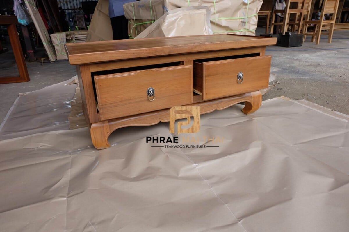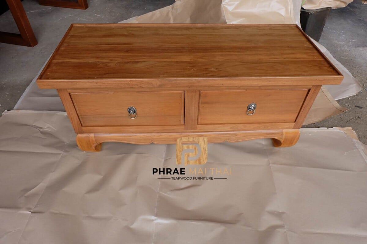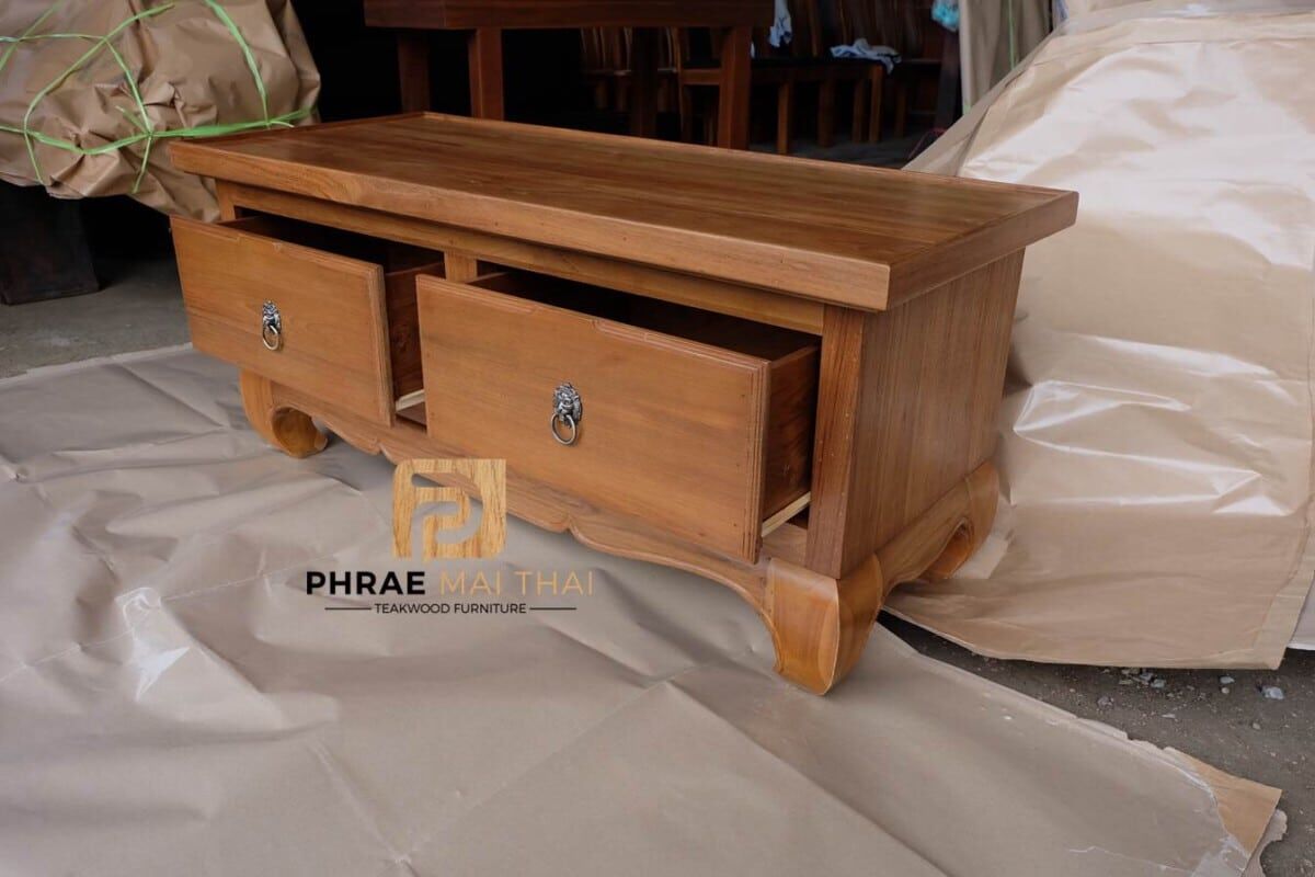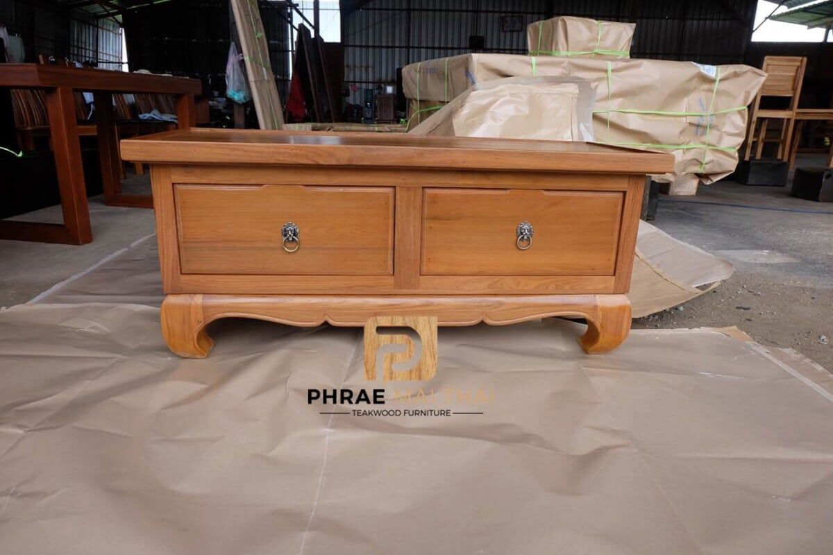 โต๊ะกลางโซฟาขาคู้ /โต๊ะอเนกประสงค์ ประกอบไปด้วย 2 ลิ้นชัก(ด้านเดียว) สีธรรมชาติ เป็นไม้สักทองอบแห้ง ซึ่งคุณสมบัติของไม้เป็นไม้เนื้อแข็งอายุตั้งแต่ 30 ปีขึ้นไป เราเลือกใช้ไม้สักที่มีคุณภาพและใช้กระบวนการอบไม้ จึงทำให้ไม้มีการคงสภาพ ความชื้นน้อย โอกาสไม้หด หรือ แตกงอน้อยมาก